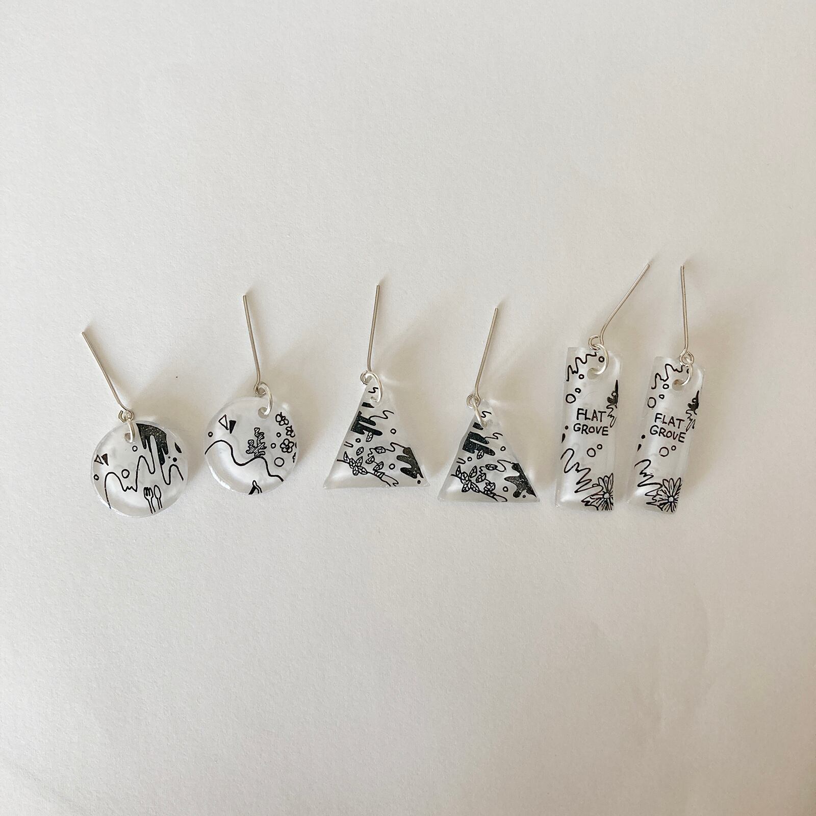 イラストレジンピアス。 サンカク・シカク・ミニ・イナヅマ・マル・タテナガの6種類。 *サンカクとシカクはイラストが一つ一つ異なります、指定はできません。